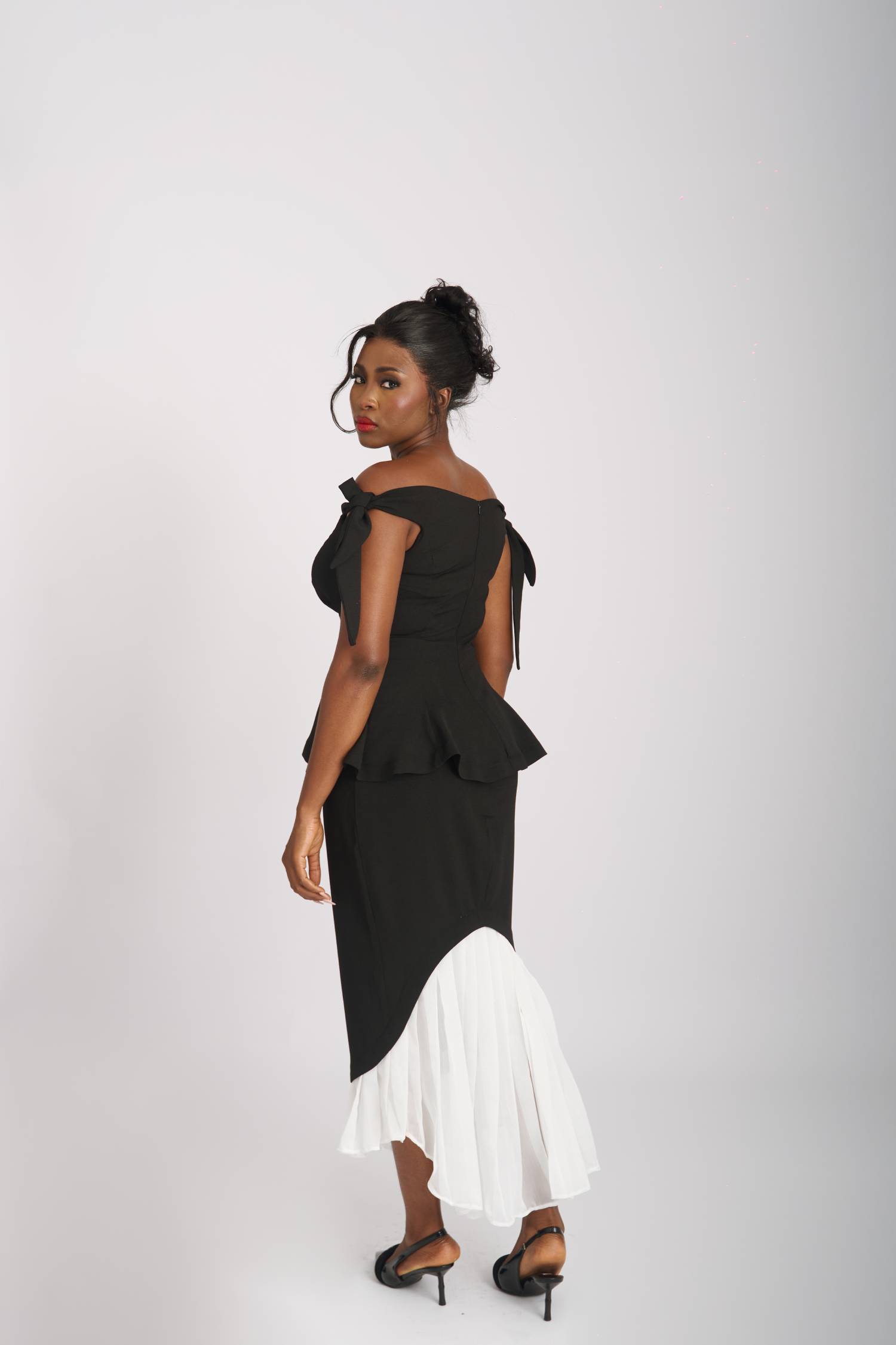 This Pair features a structured crepe peplum blouse with net cut-out shoulder and a fitted skirt designed with a refined pleated split. She is feminine, modern, and effortlessly elegant.
