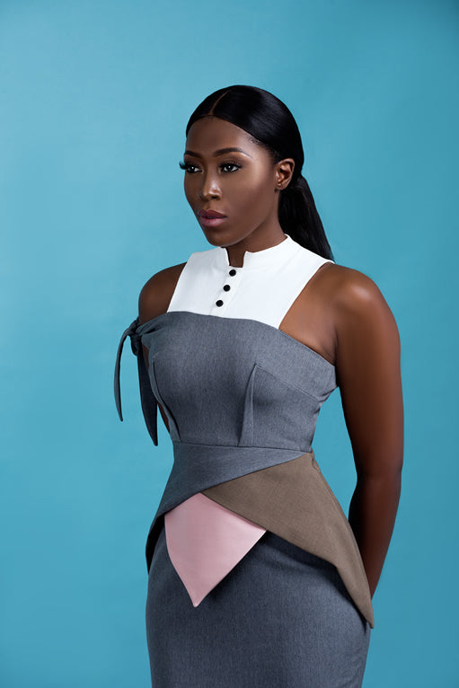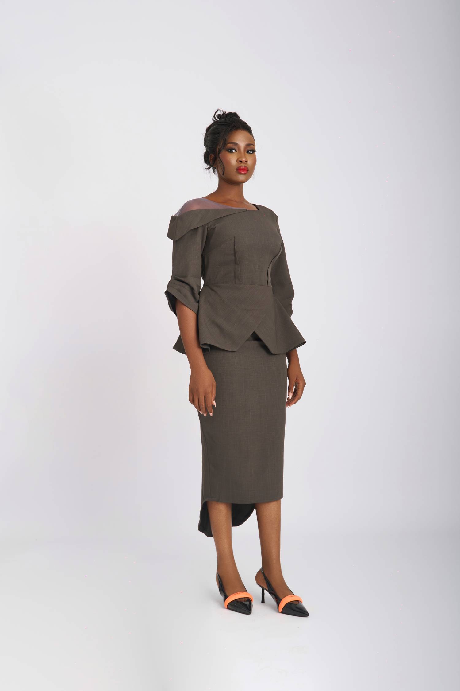 This Pair features a structured crepe peplum blouse with net cut-out shoulder and a fitted skirt designed with a refined pleated split. She is feminine, modern, and effortlessly elegant.