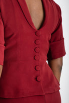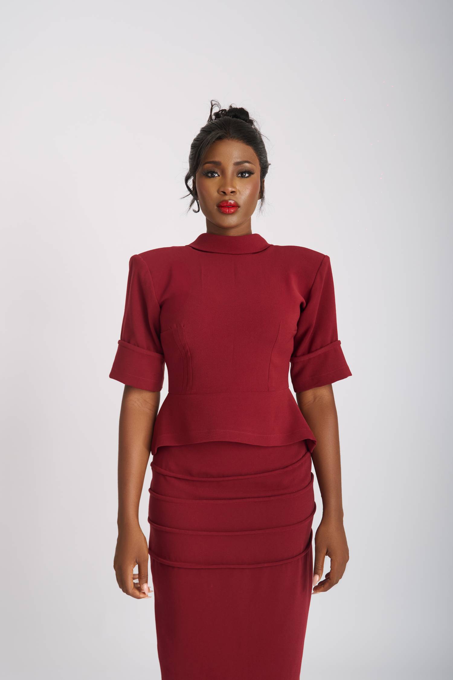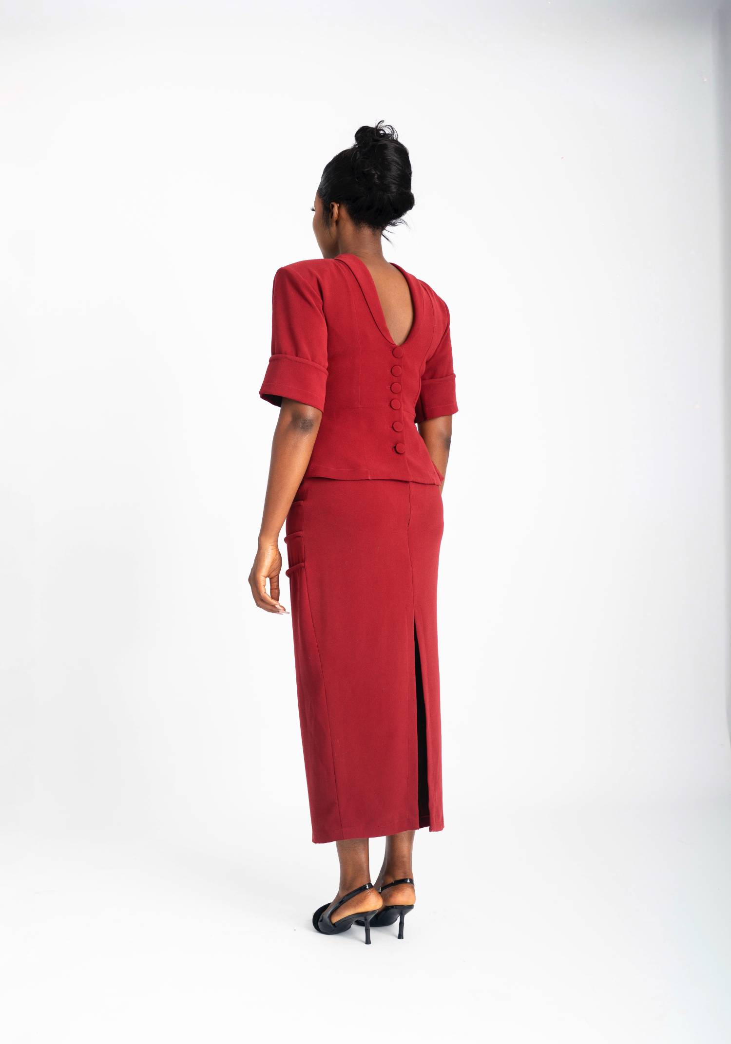 This Blouse and Skirt Pair blends refined tailoring with a soft, feminine silhouette, creating a polished, effortlessly elegant look. It features a v-neckline reverse shawl collar with button-down details at the back. The mid-elbow length sleeves highlight subtle seam work and hand-created piping detail, while the skirt is fitted with a back split and finished with hand-created piping detail. Designed to highlight elegance and femininity.