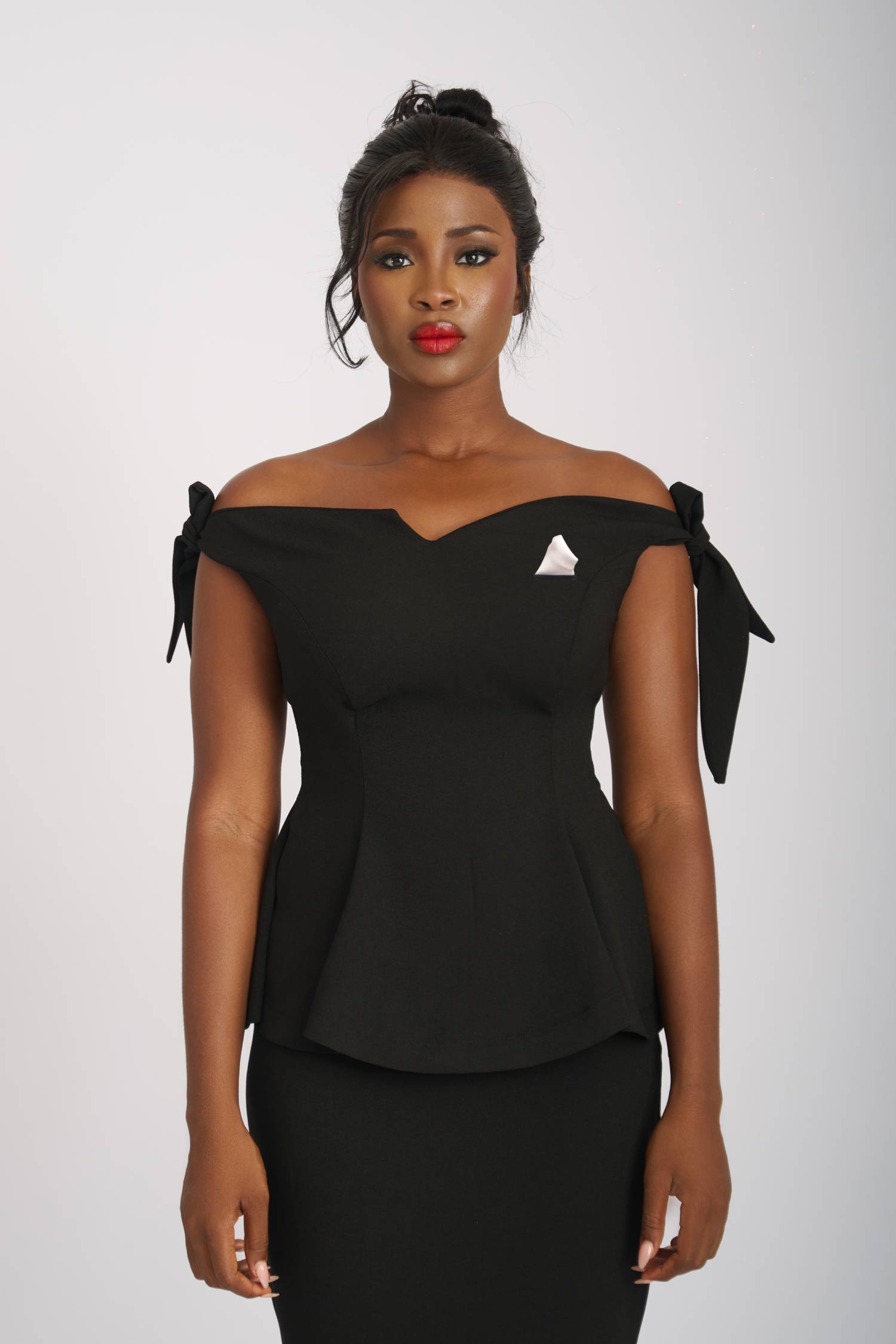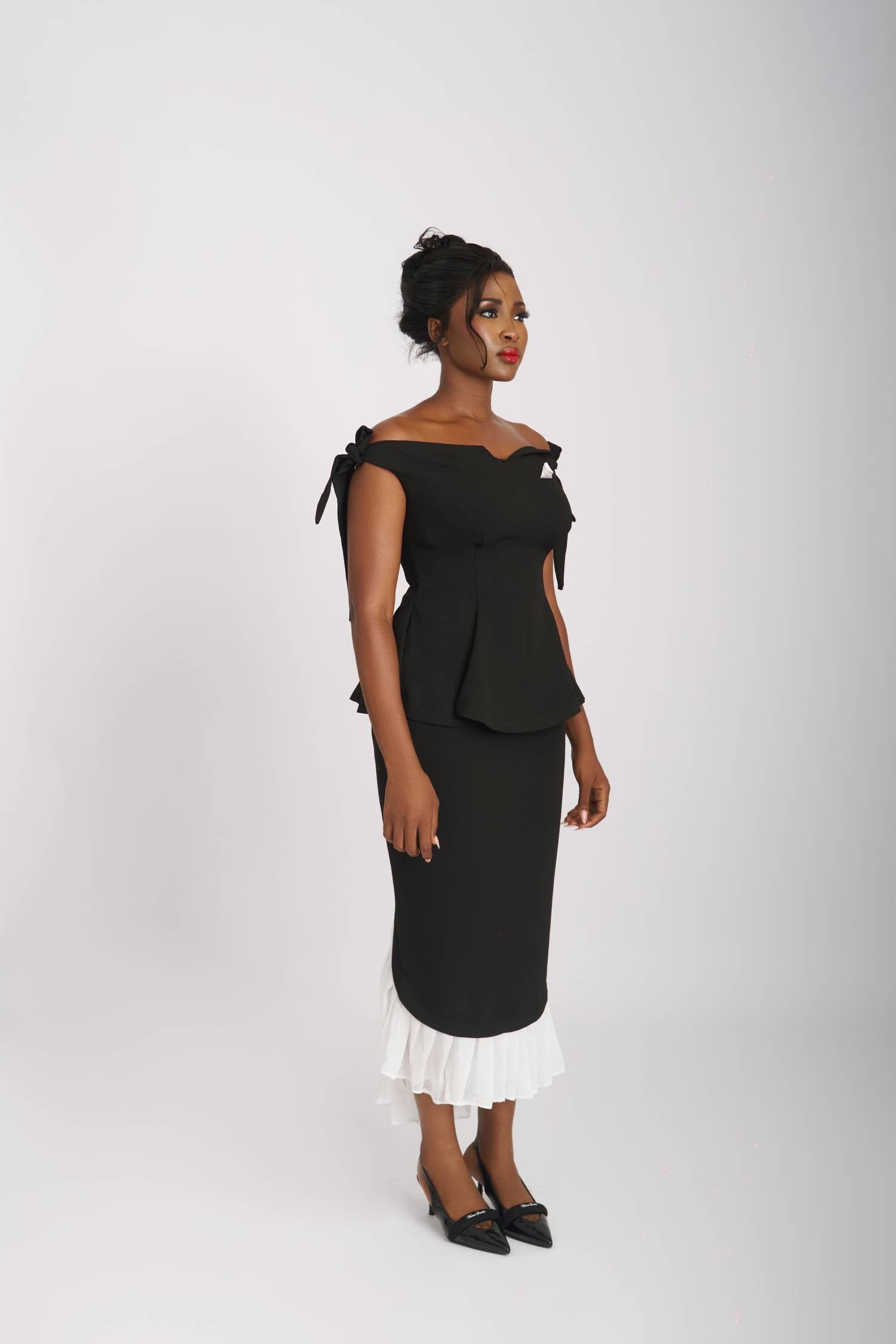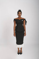 A Wana Sambo Classic, exuding timeless elegance, meet the Anna Pair. This sleeveless tie-shoulder peplum blouse pairs beautifully with a fitted midi-skirt, featuring soft chiffon with hand-made pleats and a gently rounded hemline. Designed to move gracefully with every step.