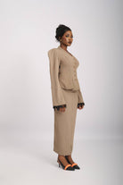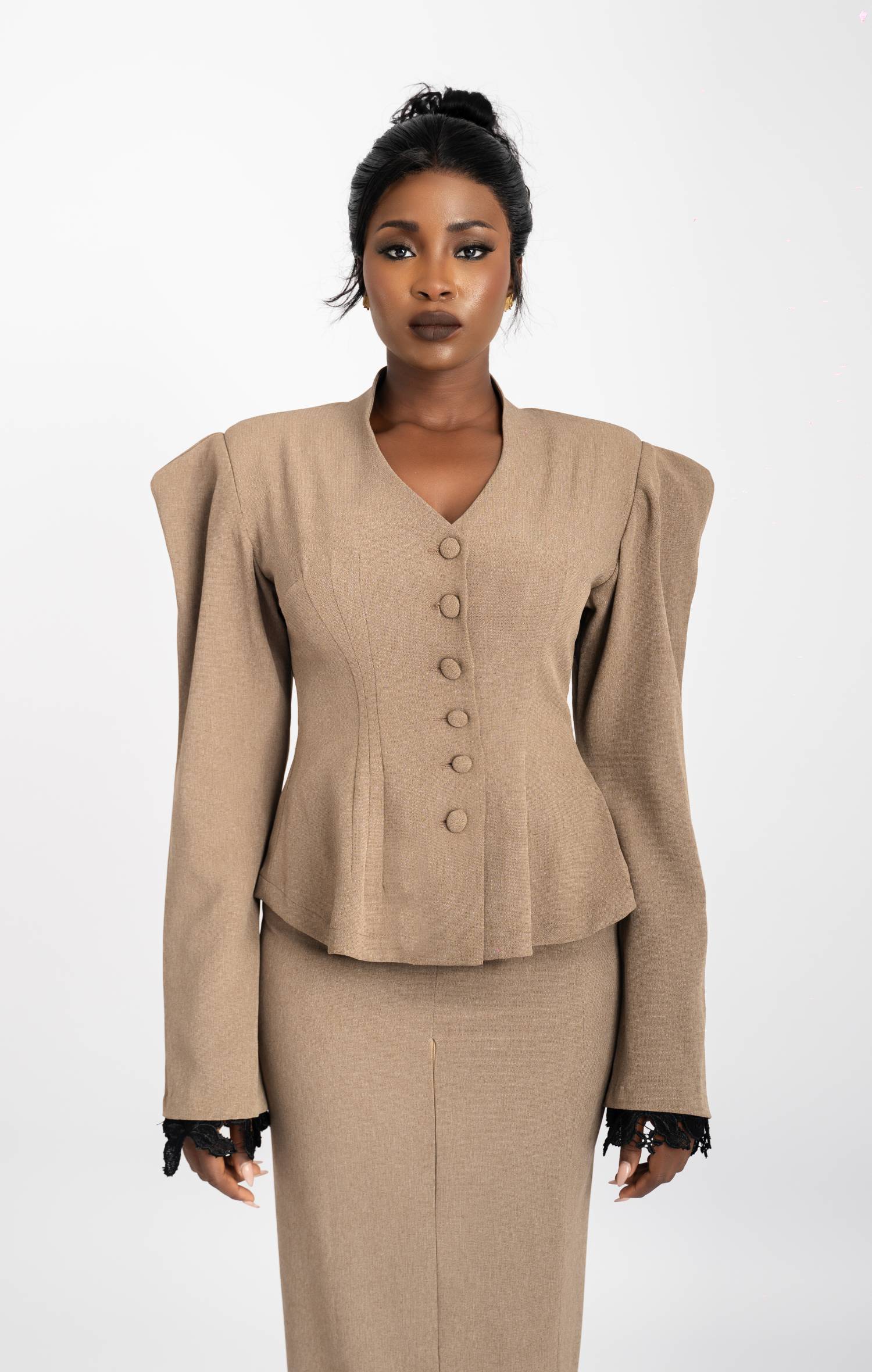 The Brown Cutout Pair is an elegant, modern two-piece available in Black and Khaki. The blouse is designed with delicate front buttons, subtle shoulder accents, Swiss lace sleeve detailing, and signature singlet-style cutouts at the back. The fitted skirt features a refined front split with an adjustable zipper for a personalised fit from day to night. Sophisticated, comfortable, and effortlessly flattering, this Pair is crafted for timeless wear.