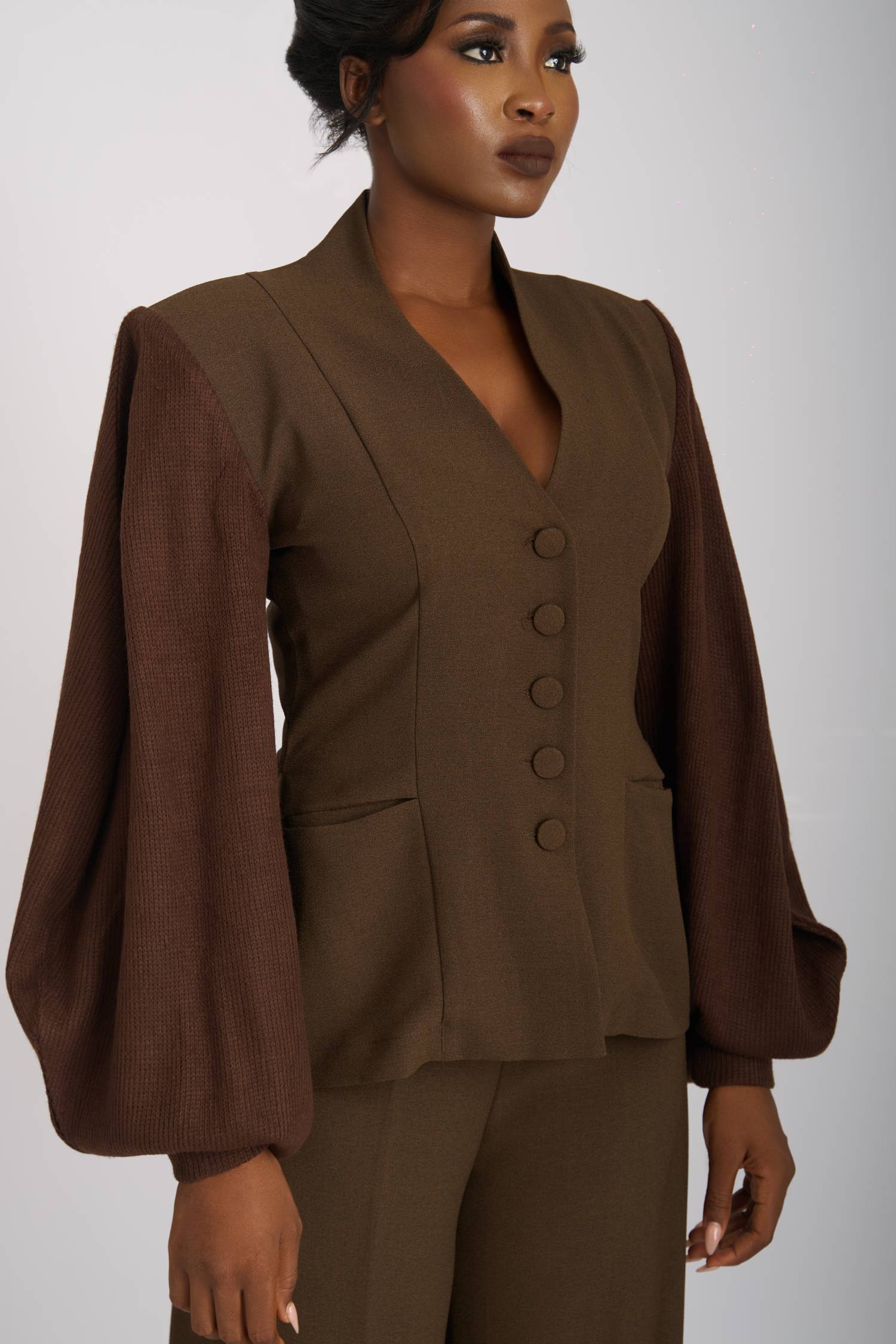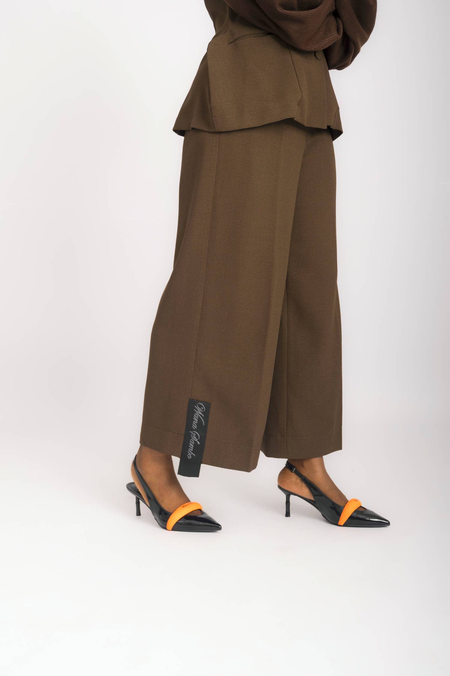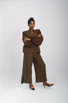 A contemporary re-interpretation of classic tailoring, this Pair features woolen-sweater-fabric sleeves sculpted with the precision of a tailored suit, complete with refined buttons, an inner pocket on the exterior, and a beautifully exaggerated hip detail blouse. The coordinating Tailored Culottes is crafted in premium crepe, offering power, structure, and comfort.