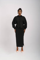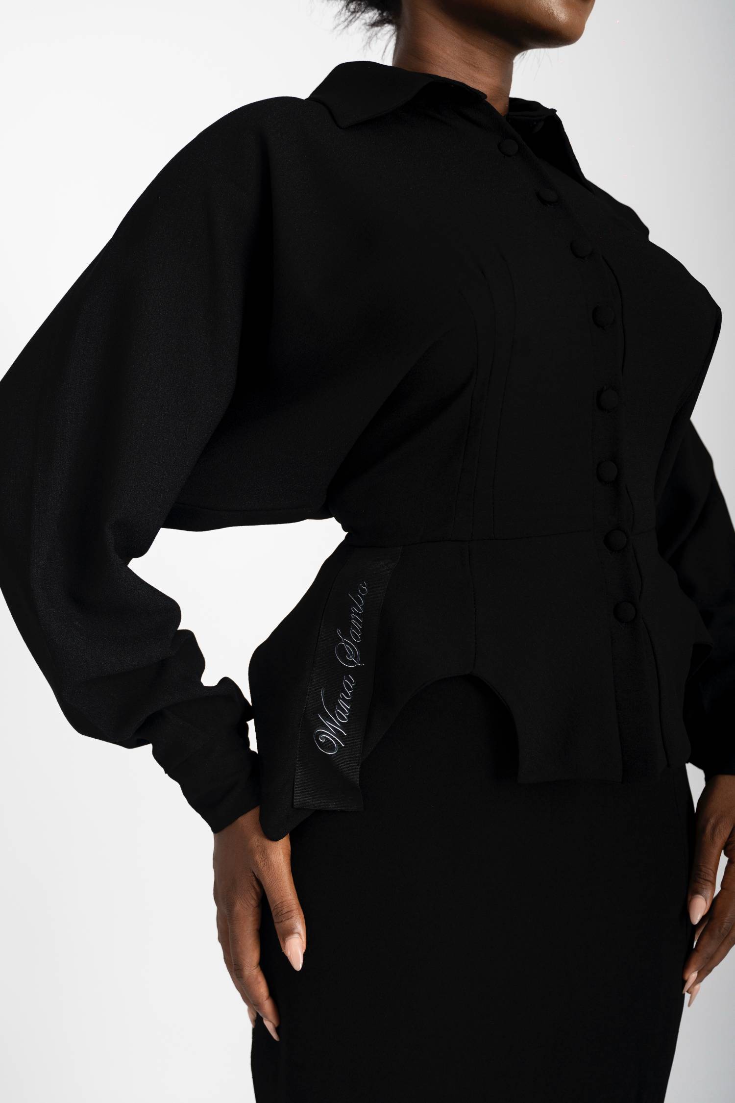The Collared Pair reimagines the classic button-down shirt with a contemporary edge. The blouse features a Mens-style collar, a striking Kite shaped bodice and bat-wing sleeve, our signature Triangle-variation peplum, accentuated by a subtle synched waistline. Styled with a skirt, the ensemble is refined sophistication.