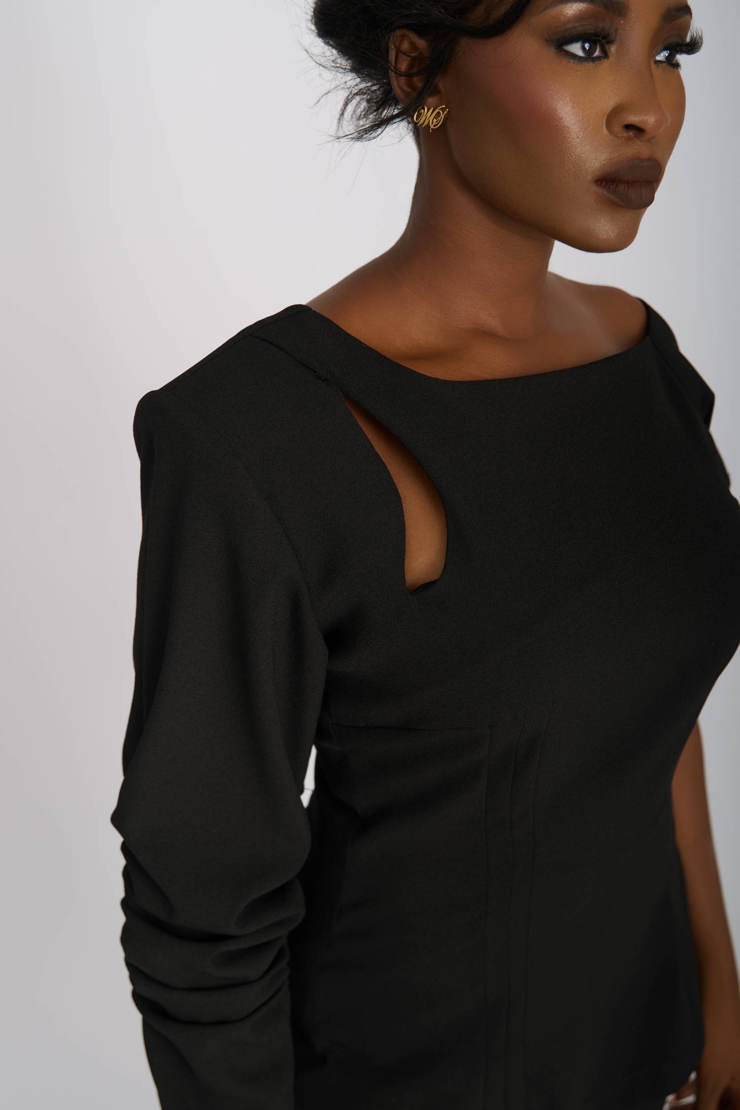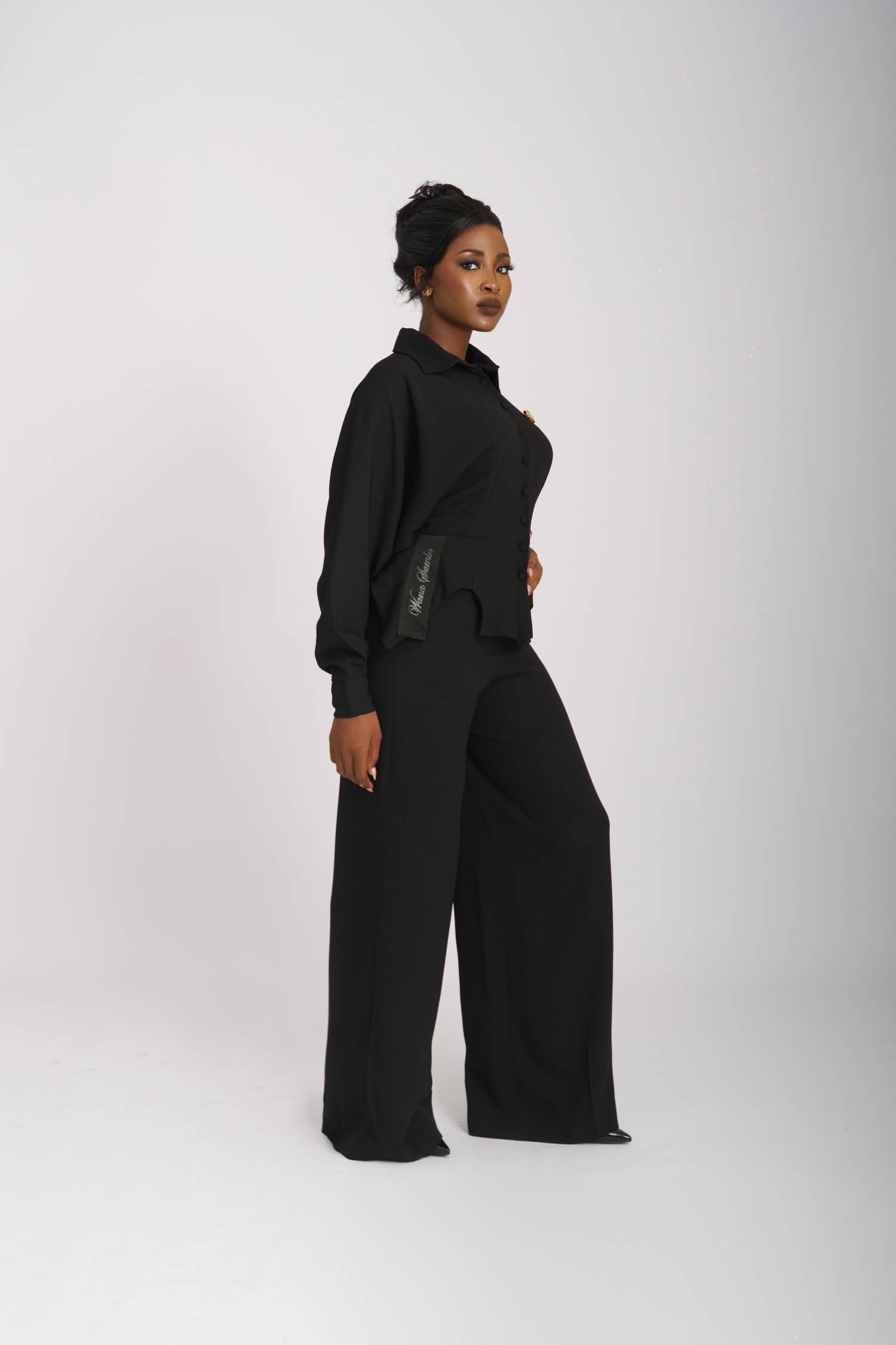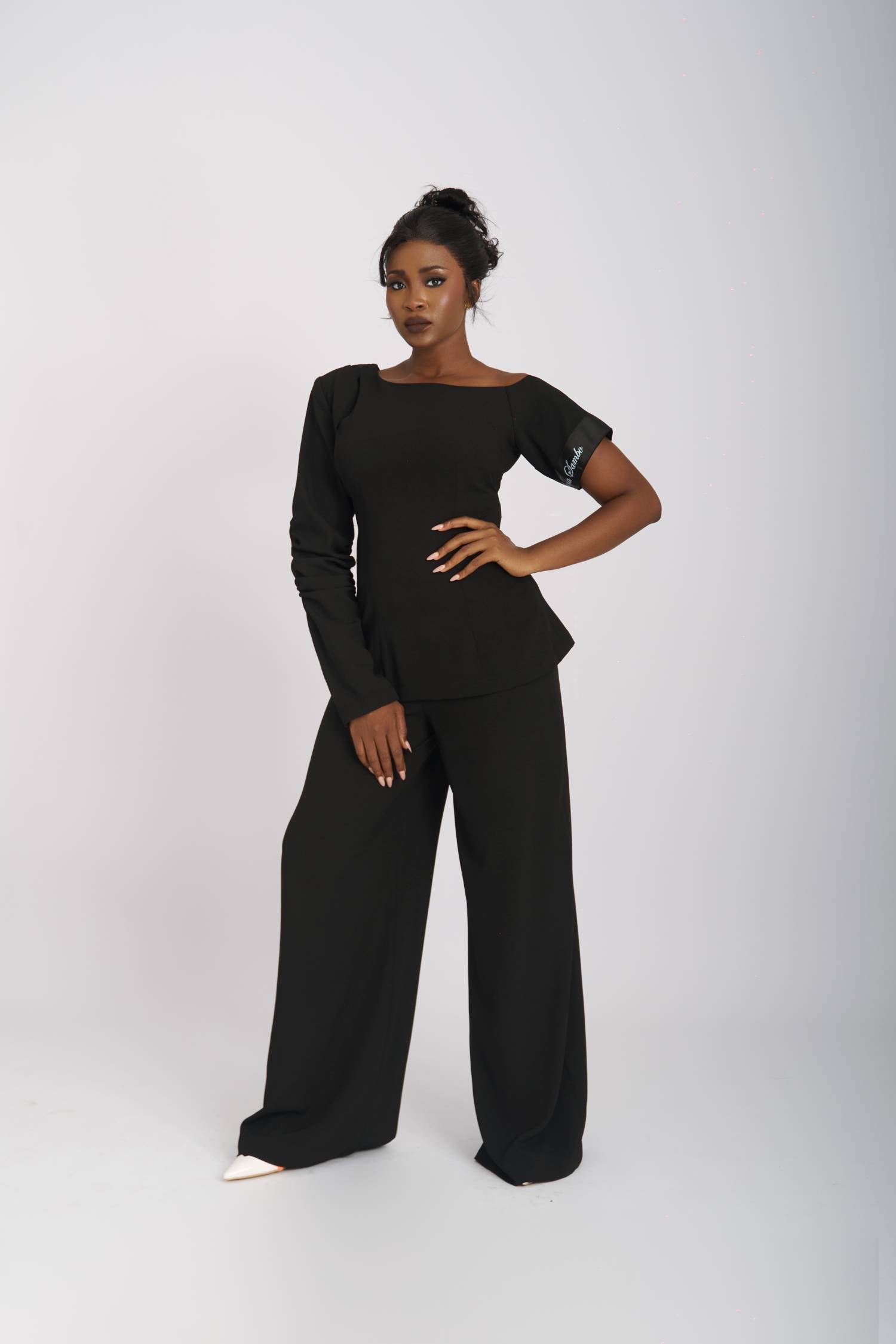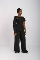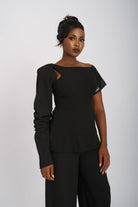 The Monostrap Pair offers a modern take on the classic mono-strap blouse made popular in the 1900’s. This design features a Tunic-style fit blouse with one gathered long-sleeve and one mid elbow length sleeve. Its delicate shoulder cut-out style creates a peek-a-boo, skin reveal. Paired effortlessly with wide-leg trousers for a look that exudes modern elegance and sophistication.